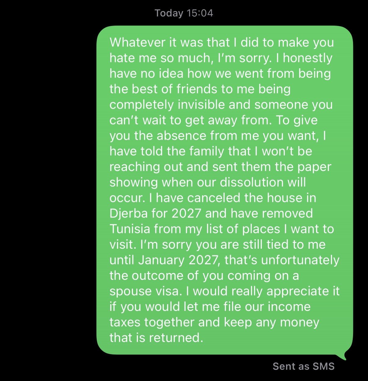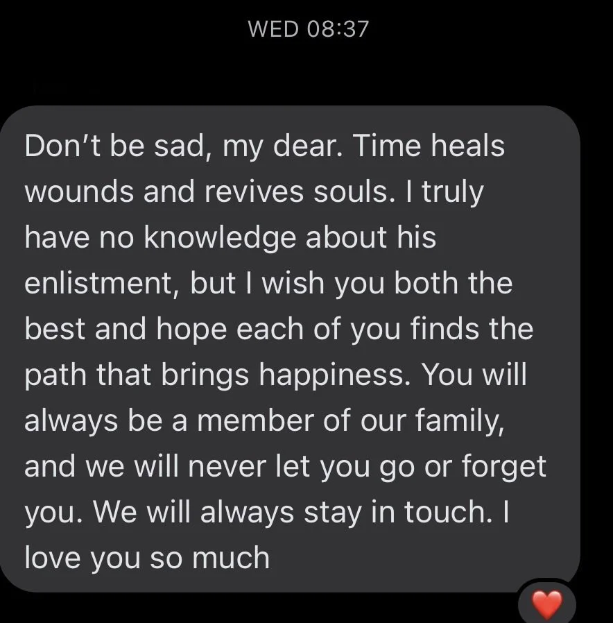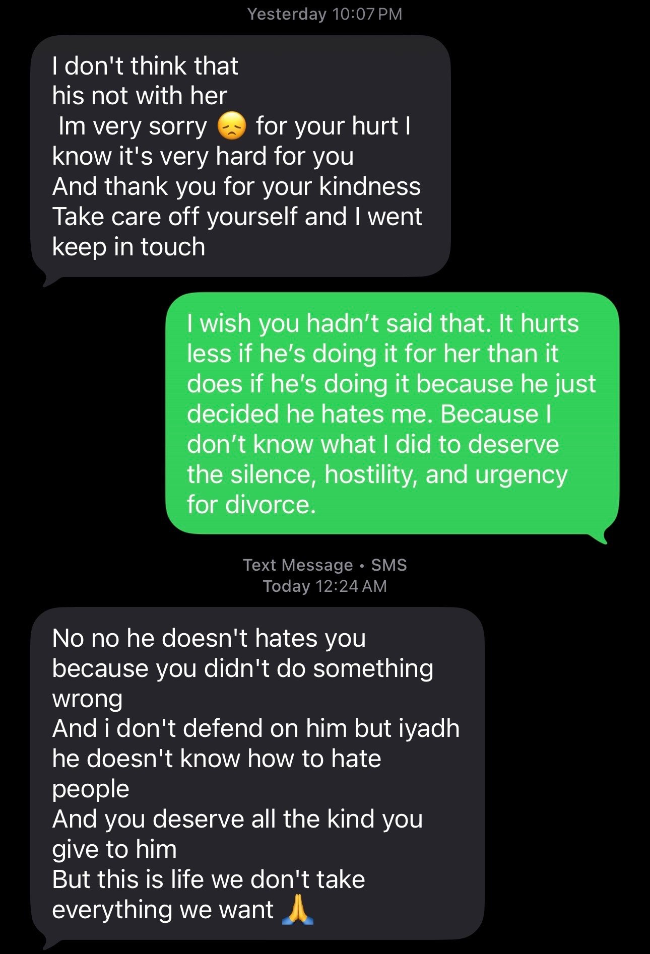 “He knows he’s wrong”…but he does it anyway. The other thing that hurts is that everyone still wants me in their life (Obviously, except Polaris, who can’t wait to get rid of me), and don’t want to accept that I want to break off the relationships. Here’s the messages with his family: