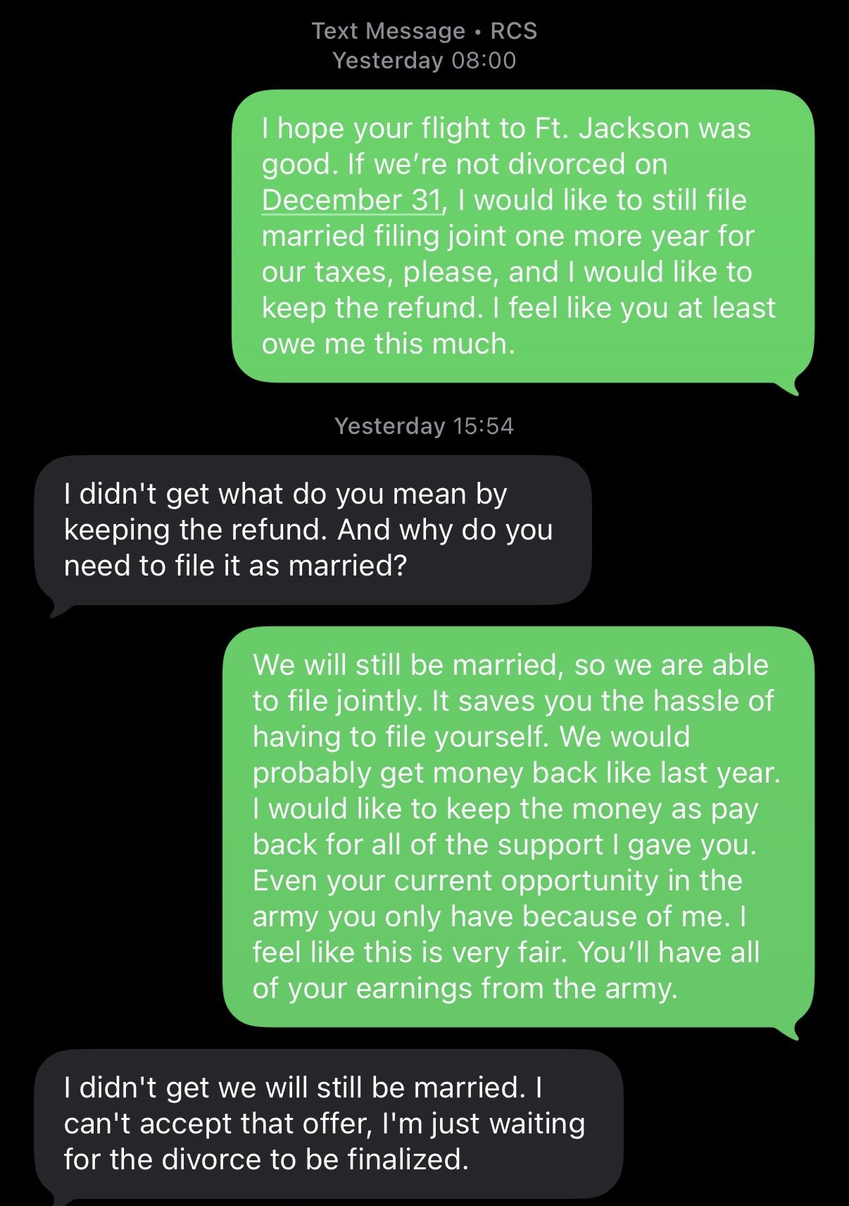 More digression… I had planned to file our income taxes together as married filing joint one more year and keeping the tax return. After all of the things that I’ve done all of myself that I’ve given I felt like I deserved that. Normally, I don’t feel entitled to things, but in this particular case, I feel entitled to that money. However, him joining the military totally threw a wrench in my plan. So I politely asked him if we could please file together and I could keep the refund. This is how the conversation went.